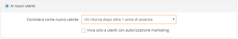 - Ai nuovi utenti: la regola è attiva verso tutti gli utenti che si registrano per la prima volta, permette di definire tramite menù a tendina il limite temporale trascorso il quale un utente registrato in precedenza viene considerato come "nuovo utente".